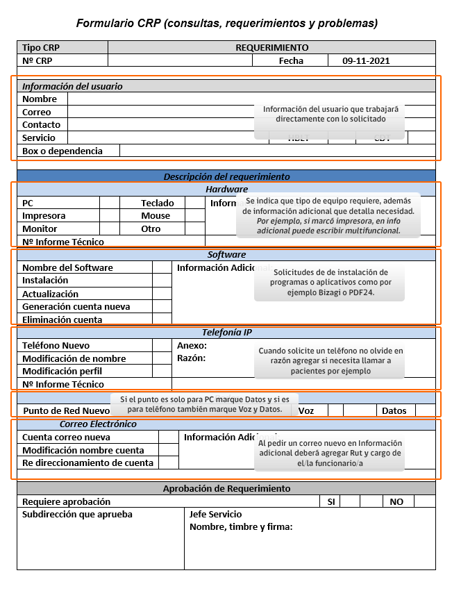 Con este documento se canalizan los requerimientos de equipos, correos electrónicos, teléfonos IP, impresoras, lector de huella u otro hardware. Debe estar autorizado (firmado y timbrado) por la jefatura de quien solicita abajo a la derecha y la subdirección (firmado y timbrado) abajo a la izquierda correspondiente a la unidad.